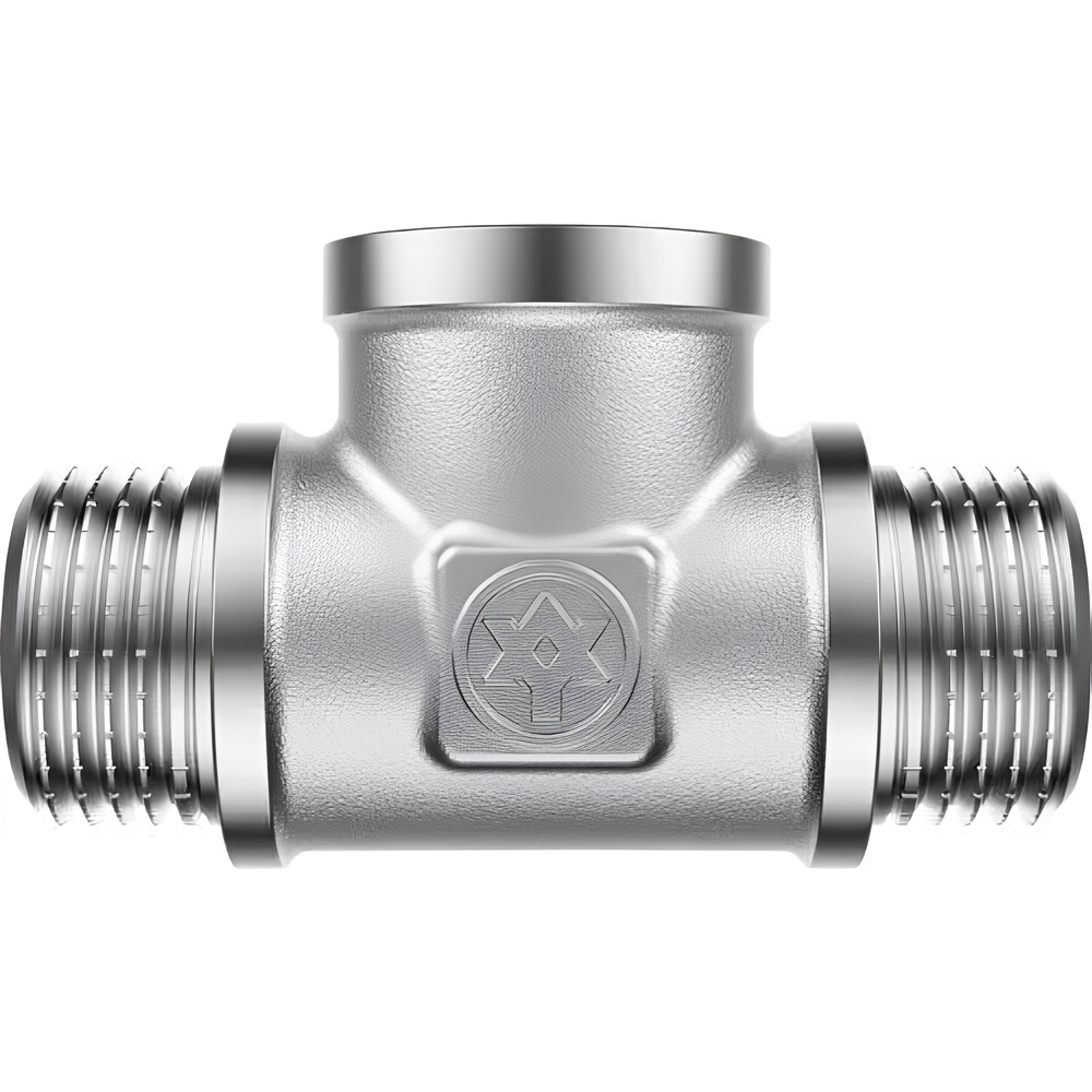 Трійник – це різьбова сполучна деталь, яка використовується для створення роз’ємних різьбових з’єднань на трубопроводах холодного питного, господарського та гарячого водопостачання, опалення, стиснутого повітря та на технологічних трубопроводах. Різьбовий фітинг – трійник 2 зовнішні різьблення і 1 внутрішнє. Корпус виготовлений з латуні та покритий тонким шаром Ni(нікель), для надання антикорозійних якостей. Використовується для розведення труб у 3 напрямках.